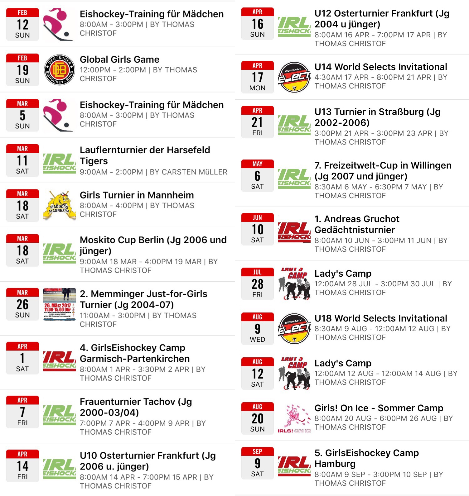 20 Girls-ONLY Events in den kommenden Wochen und Monaten finden sich in unserem Kalender, darunter 9 Turnierteilnahmen von GirlsEishockey.de Teams, 2 anstehende GirlsEishockey Camps, unser 1. Andreas-Gruchot-Gedächtnisturnier im Sommer, das Global Girls Game, sowie Turniere und Camps anderer Veranstalter. Nicht aufgeführt in der Liste sind Girls Days von Vereinen und offizielle DEB U Maßnahmen.