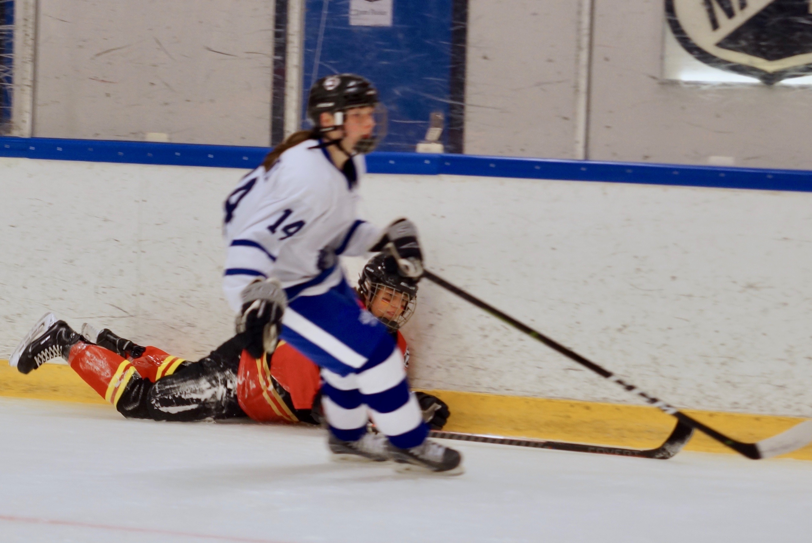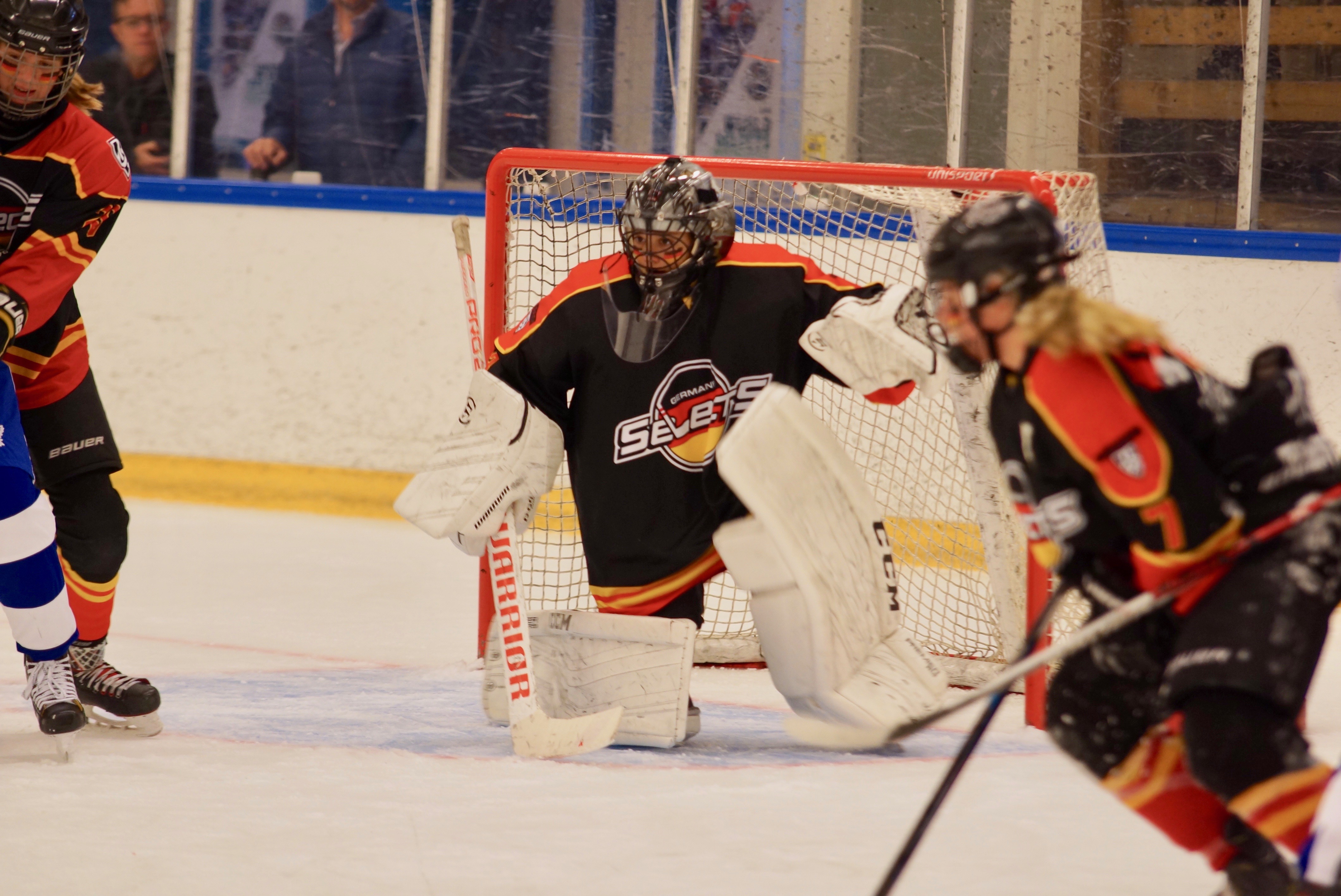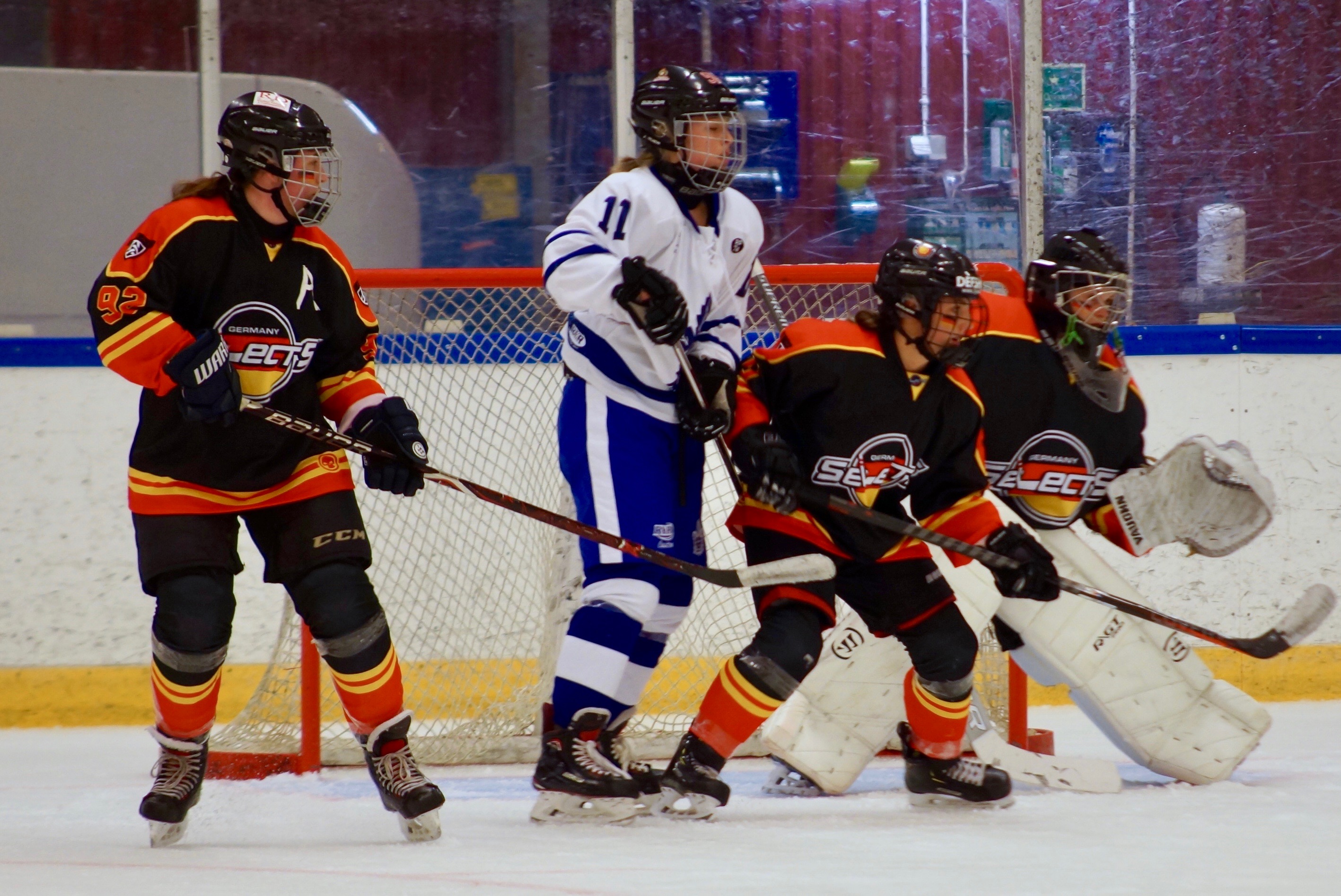 ProHockey White traf dann sogar zu einem frühen 2 zu 0 in der 8. Spielminute – ein unglückliches Tor, da das Team Germany Selects zu diesem Zeitpunkt in der ersten Überzahlsituation der Partie eigentlich die Oberhand haben sollten, doch ein verdeckter Schuss von der blauen Linie schlug hinter Goalie Felicity ein, so dass das Team um Trainer Jan nun die schwere Aufgabe vor sich hatten, das Spiel zu drehen. Doch zwei Minuten nach dieser kalten Dusche konnte Stürmerin Nina C. mit einer tollen Einzelaktion aus dem Verteidigungsdrittel, über die neutrale Zone in das Angriffsdrittel von ProHockey White ziehen und mit einem platzierten Schuss über die Fanghand des nordamerikanischen Goalies zum Anschlusstreffer einnetzen.